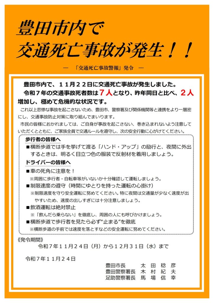 豊田市内で交通死亡事故発生!「交通死亡事故警報」発令中!